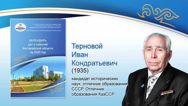 04.07.2025 | | Уважаемые читатели! Отдел информационно-библиографического обеспечения представляет видеодосье о кандидате исторических наук, отличнике образования СССР, Отличнике образования КазССР Иване Кондратьевиче Терновом.Для просмотра...