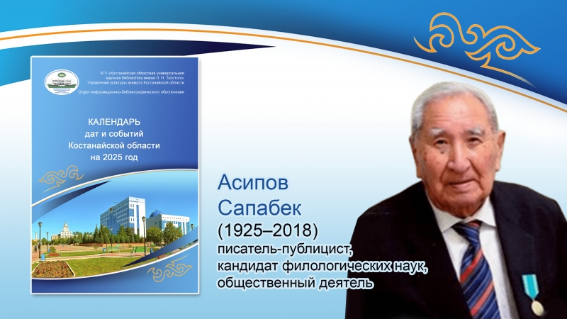 | События 18.11.2025 | | Уважаемые читатели! Отдел информационно-библиографического обеспечения представляет видеодосье о писателе-публицисте, кандидате филологических наук, общественном деятеле Сапабеке Асипове. Для просмотра перейдите...
