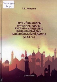 | Ахметов, Т. Ә. Түркі ойшылдары мұраларындағы рухани-имандылық құндылықтардың қалыптасуы мен дамуы (VI–XII ғ.ғ.) 74.03(5Қаз) А 94 Ахметов, Т. Ә. Түркі ойшылдары мұраларындағы рухани-имандылық құндылықтардың қалыптасуы мен дамуы (VI–XII ғ.ғ.) [Мәтін] : монография / Т. Ә. Ахметов ; ҚР Ғылым және жоғары білім м-гі, А. Байтұрсынов ат. Қостанай өңірлік ун-ті ; [ред. М. Жұмашев]. – Қостанай : ҚӨУ баспасы, 2023. – 164 б.
