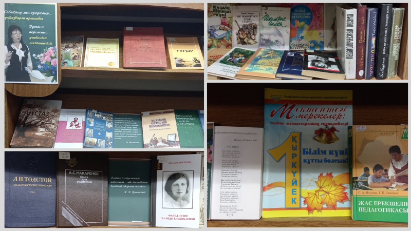 Ұсынылған көрмеден сіздер педагогикалық шеберліктің негіздері туралы, жалпы білім беру мекемелерінде оқу үдерісін ұйымдастыру, балалармен тәрбие жұмысын жүргізу туралы ақпаратты қамтитын материалдармен таныса аласыздар. Назарларыңызға білімнің барлық салалары бойынша әдістемелік, ғылыми-көпшілік және анықтамалық құралдар, мектеп бағдарламасына көмекші құрал ретінде шығарылған жаңа әдебиеттер, көркем шығармалар мен мерзімді басылымдар ұсынылады. Олардың ішінде Ы. Алтынсарин, Ш.Құдайбердиев, Л. Н. Толстой, А. С. Макаренко, В. А. Сухомлинский, К. Д. Ушинский сияқты және т. б. әлемге әйгілі және көрнекті педагог-ағартушылардың еңбектері ерекше орын алады.