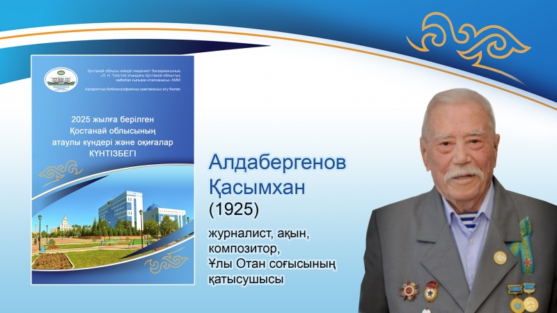 11.09.2025 | | Құрметті пайдаланушылар! Ақпараттық-библиографиялық қамтамасыз ету бөлімі журналист, ақын, композитор, Ұлы Отан соғысының қатысушысы Қасымхан Алдабергенов туралы бейнедерекнаманы ұсынады. Қарау үшін сілтеме бойынша өтіңіздер:...