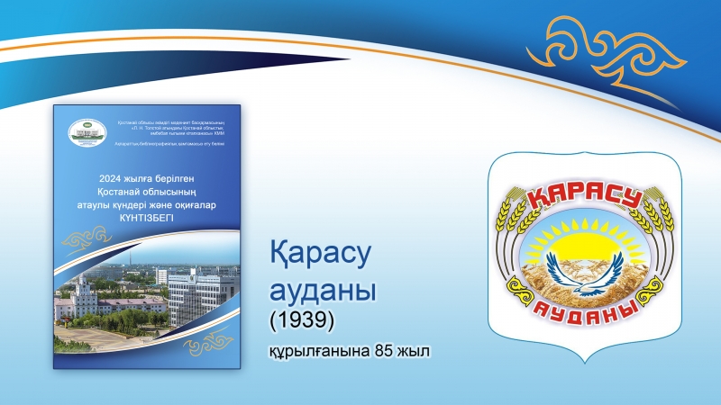 15.10.2024 | | Құрметті пайдаланушылар! Ақпараттық-библиографиялық қамтамасыз ету бөлімі Қарасу ауданының құрылғанына 85 жыл толуына арналған бейнедерекнама ұсынады.Қарау үшін сілтеме бойынша өтіңіздер: https://youtu.be/k4N5TKilAdE ...