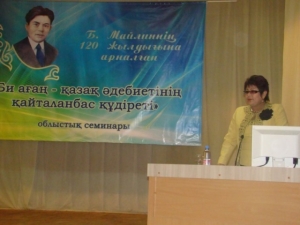 | «Би ағаң – қазақ әдебиетінің қайталанбас құдіреті» облыстық семинары | 29.10.2014 | 2014 жылдың 29 қазаны күні Л.Н.Толстой ат. ОӘҒК Таран ОАК жерлесіміз, жазушы, көсемсөзші және қоғам қайраткері Бейімбет Майлиннің 120 жылдығына арналған «Би ағаң – қазақ әдебиетінің қайталанбас құдіреті» атты облыстық семинар өткізілді. Семинарға облыстың мемлекеттік кітапханаларының кітапханашылары қатысты. Семинар Бейімбет Майлиннің кеуітіне салтанатты гүл қоюдан және семинарға қатысушыларды құттықтаудан басталды. Бұдан кейін Бейімбет Майлин ат. аудандық тарихи-өлкетану мұражайына экскурсия ұйымдастырылды. Бұл жерде Бейімбет Майлиннің өмірі мен шығармашылығына арналған экспонаттар мен материалдардың үлкен бөлімі орналасқан. Ауданық ОКЖ мен Л.Н.Толстой ат. ОӘҒК аудандық МҮ фойесінде «Қалам майталманы Бейімбет Майлин – 120 ж.» кітап көрмесін ұйымдастырды. Семинар қонақтары көрменің материалдарын қызыға тамашалап, көрмеге қойылған әдебиеттер бойынша дайындалған шолуды ерекше ықыласпен тыңдады. Бұдан кейін МҮ семинардың салтанатты ашылуы болып, ол Таран ауданы әкімінің әлеуметтік мәселелер жөніндегі орынбасары Дидар Мұхамеджанұлы Аққұловтың қатысушыларды құттықтауымен ашылды. Қостанай облысы әкімдігі мәдениет басқармасы атынан семинар қонақтарын аға маман Олжабаева Роза Төлешқызы құттықтады. Баяндамашылардың хабарламаларынан семинарға қатысушылар даңқты жерлесіміздің өмірі мен шығармашылығы жайында көптеген қызықты және жаңа ақпараттар алды. Ақын Бердалинова Ғайнижамал Сайманқызы «Бейімбет Майлин өмірінің қызықты деректері» баяндамасында жазушының өмірінен, оның қазіргі «Қостанай таңы», бұрынғы «Ауыл» Қостанай облыстық газетінде жұмыс істеген кезінде орын алған қызықты жайлар жайында деректер келтірді. А.Байтұрсынов ат. ҚМУ тіл және әдебиет кафедрасының оқытушысы Төлегенова Шынар Исламбекқызы «Дара туған Бейімбет» баяндамасында Бейімбет Майлиннің шығармашылығына талдау жасады. Тобыл орта мектебінің қазақ тілі мен әдебиетінің мұғалімі, Б.Майлиннің туысы және жазушының шығармашылығын зерттеуші Ұлбике Байдрахманқызы Қасымова «Би-аға мәңгі есімізде...» тақырыбына баяндама жасады. Ғылыми-әдістемелік жұмыстар бөлімінің маманы Нәзима Қуанышбайқызы Оташева облыстық тарихи-өлкетану мұражайы қорларының Бейімбет Майлин жайындағы құжаттармен толықтырылуы жайында айтып берді. Таран халық театры әртістерінің орындауымен Бейімбет Майлиннің «Келін мен шешей» пьесасы бойынша қойылған спектакль үзіндісі жиналғандардың ризашылығын тудырды (режиссері Луценко Нина Владимировна). Л.Н.Толстой ат. ОӘҒК кітапханаларды дамыту бөлімінің аға кеңесшісі Рахымбекова Айжан Сұлтанқызы өткізген «Б. Майлиннің шығармалары – өмірдің көркем шежіресі» әдеби пікірталасы аясында Бейімбет Майлиннің шығармаларын насихаттау бойынша тәжірибе алмасу болды. Семинар жұмысын қорытындылар тұста Б.Майлиннің 120 жылдығына арналған облыстық блогтар байқауының қорытындысы шығарылып, жеңімпаздар марапатталды (Лисаков ҚОК, Таран және Жітіқара ОКЖ). Семинар жұмысын «Қостанай таңы» газетінің тілшісі Нұрболат Мешітбаев оның өтілуі барысында жедел жеткізіп отырды. | | | | Кері қарай |