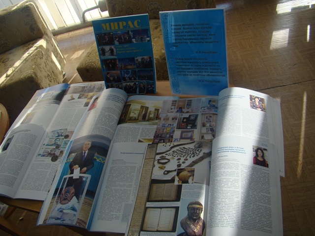 | «Жетістіктер мен гүлденуге жетудің жолы» | 27.11.2014 | 2014 жылдың 27 қарашасында сағат 11.00-де Л.Н.Толстой ат. облыстық әмбебап ғылыми кітапханада «Жетістіктер мен гүлденуге жетудің жолы» (1 желтоқсан – тұңғыш Президент күні) тақырыбымен республикалық «Мирас» қоғамдық-саяси және ғылыми-көпшілік журналымен танысу болып өтті. «Мирас» қоғамдық-саяси және ғылыми-көпшілік журналы Қазақстанның қоғамдық дамуындағы өзекті мәселелерге терең талдау жасап отырады, қоғамның дамуындағы маңызды оқиғалар мен процестерді жариялап отырады. Шараға шақырылған №3 қалалық кітапхананың меңгерушісі Р.Тасмағанбетоваға «Ресей Назарбаев жайында» деректі фильмін ұсынып, оған түсінік берді. Қонақтар назарына сондай-ақ «Тұңғыш президент мұражайы» деректі фильмі де көрсетілді, Тұңғыш президент мұражайы жайындағы және осы мұражай шығаратын «Мирас» журналы жайындағы ақпарат ұсынылып, көрікті көрме көрсетілді.