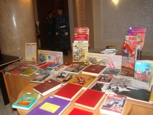 | ҚР Ұлттық гвардиясының 6697 әскери бөлімімен ұйымдастырылған «Біз Жеңіс ұрпақтарымыз» акциясы шеңберінде Жеңістің 70жылдығына арналған «Жеңісті жеткізген лента» атты кітап көрмесі безендірілді. | 18.02.2015 | 16 ақпан күні балалардың қалалық шығармашылық үйінде Л.Н.Толстой ат. облыстық кітапхананың өнер туралы әдебиеттер бөлімінің қызметкерлері өздерінің қорларындағы Ұлы Отан соғысының негізгі оқиғаларын, халқымыздың Жеңіс жолындағы басынан кешкен қиындықтарын баяндайтын әдебиеттер қойылған «Жеңісті жеткізген лента» атты кітап көрмесін безендірді. Тарихи қысқаша анықтамалар, соғыс жайындағы әсерлі әңгімелер декреті фотосуреттермен және суреттермен безендірілген. «Соғыс және Жеңіс жырлары» бөлімінде соғыс жылдарындағы әндер мен марштар жазылған кітаптар, күйтабақтар, ақындар, жазушылар, майдангерлер жазған ән жинақтары қойылған. Ұлы Отан соғысында майданда қайтыс болған композиторлар, әншілер мен музыканттар туралы, соғыс кезіндегі көптеген әндердің тағыдырлары жайындағы кітаптар қойылған. Жауынгерлердің рухын көтерген, ертеңгі күннен үміт күттіріп, жеңіске деген сенімді арттырған музыканың жеңіске қосқан үлесі орасан болды. Кескіндеме, мүсін және графика саласының шығармалары: әскери суреттер мен үгіт жұмыстары, соғыс сәттері бейнеленген фотосуреттер, соғысқа қатысқан суретшілердің қалпына келтірілген шығармалары көрменің «Соғыс жайындағы суреттер» бөлігіне қойылған. Ұлы Отан соғысы мен Жеңіске арналған деректі фильмдер көрсетілді. Кітапхана қызметкерлері сонымен қатар «Біз Жеңістің мұрагерлеріміз!» акциясы аясында 6697 әскери бөлімі ұйымдастырған Жеңістің 70 жылдығына арналған эстафетаның салтанатты бөлігін өткізуге белсенді қатысты. Соғыс туралы театрландырылған «Аман бол, інішек» композициясына қатысты. Соғыстың басталуы, мектеп түлектерінің майданға аттануы, оларды қыздардың шығарып салулары және майданда кездеу сәттері туралы көріністер қойылды. Аналарына хат жазып жатқан, аналарының оларды қалай күтіп жүргендері, ұлдарына хат жазған сәттері сахналанды. Шараға ҰОС ардегерлері, 6697 әскери бөлімінің ардагерлері, Ауғанстандағы жергілікті соқысқа қатысқан жауынгерлер, ҚАЖ академиясының және қаламыздағы әскери-патриоттық клубының курсанттары, басқа да шақырылған қонақтар қатысты. | | | | Кері қарай |