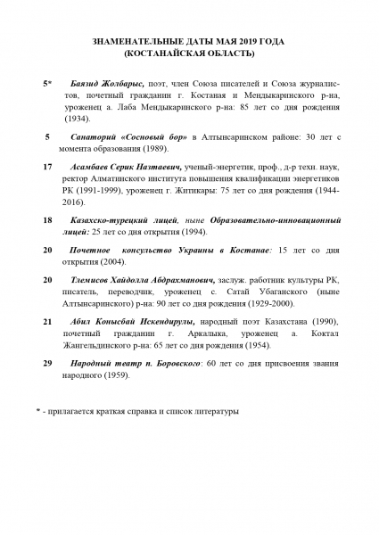 | Календарь знаменательных дат Костанайской области 2019 года.