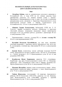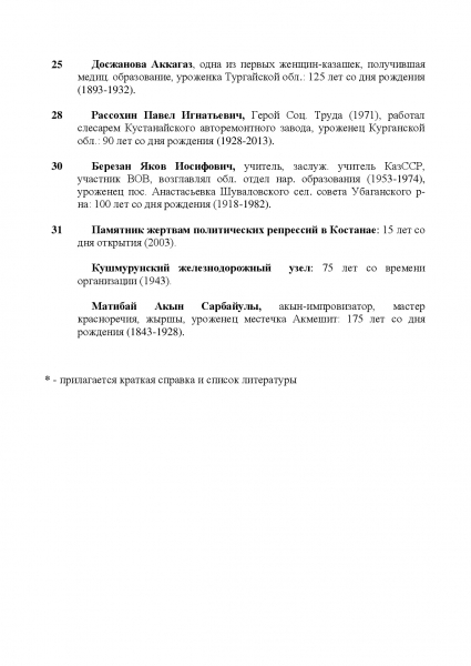 | Календарь знаменательных дат Костанайской области 2018 года.