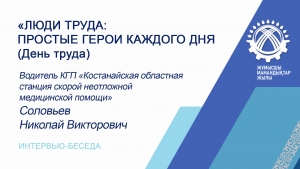13.10.2025 | | 13 октября в онлайн-формате состоялась беседа «Люди труда: простые герои каждого дня» с водителем КГП «Костанайская областная станция скорой неотложной медицинской помощи» Соловьевым Николаем Викторовичем.В современном мире...