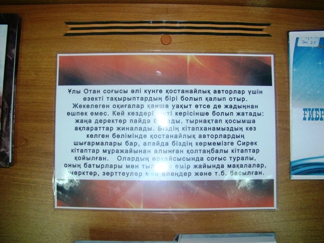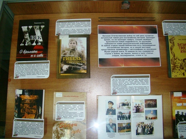 | О войне словами костанайцев | 06.04.2015 | Уважаемые читатели! Приглашаем вас на выставку, которая демонстрируется в фойе первого этажа с 6 апреля по 6 июня. О войне написано много и эта тема никогда не перестанет волновать людей, бередя старые раны и душу болью сердца. Писатель не может не бередить раны, потому что память и история слились воедино. И невозможно переоценить заслугу поэтов и писателей, коснувшихся темы войны, как невозможно переоценить и подвиг народа. Уважаемые читатели у вас есть возможность прикоснуться к истории, услышать живой голос свидетелей-очевидцев тех грозных событий, которые бесстрашно и гордо шагнули в зарево войны, для которых война была не просто материалом для книг, а судьбой народа и их собственной. Мы собрали для вас произведения кустанайских поэтов и писателей, начиная с далёкого 1941 года и по современное время. Все эти книги входят в коллекцию нашего музея, так как каждая из них имеет автограф автора. | | | | Назад |