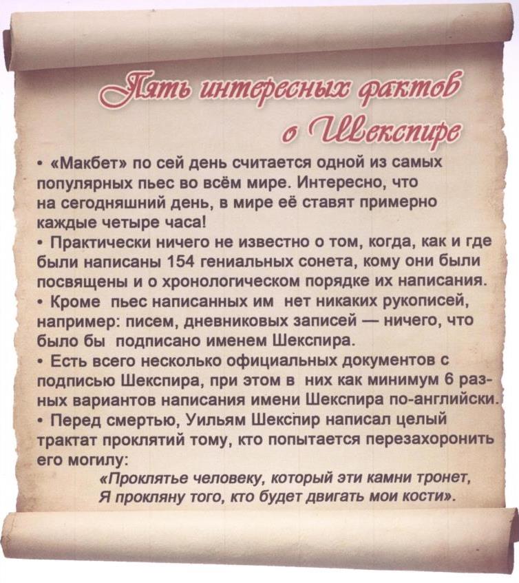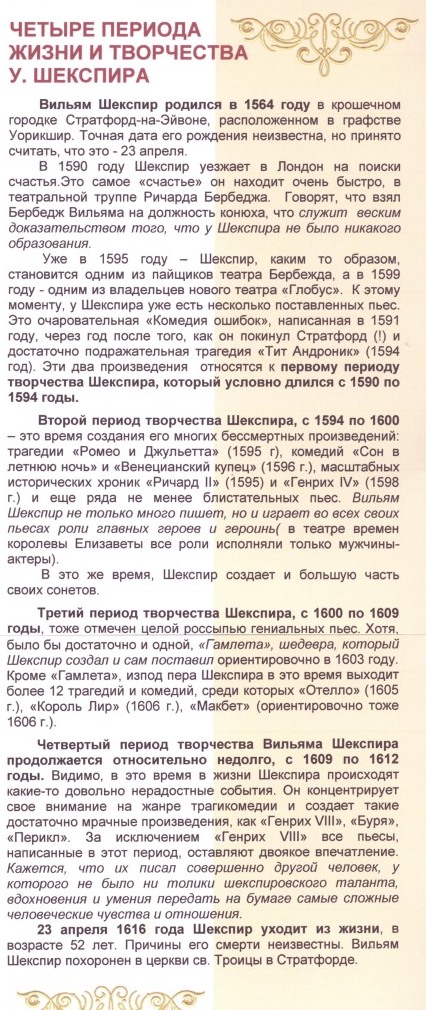 | «Лгут зеркала,– какой же я старик…» ![]() ![]() 2014-й — год Шекспира. В апреле мир отпразднует 450-летие величайшего и, пожалуй, самого загадочного драматурга. На выставке представлены издания из фонда редкой книги ОУНБ им. Л.Н.Толстого. В первом разделе собрана информация автобиографического характера, состоящая из 4 этапов жизни и творчества писателя, а также 5 интересных фактов о У.Шекспире. Во втором