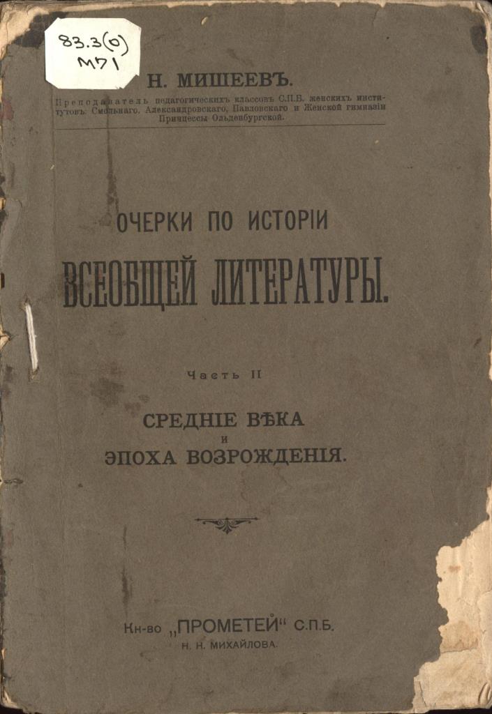 роли Бенедикта и Беатриче. ![]() 83.3(0) Мишеев Н. М71 Очерки по истории всеобщей литературы. Средние века и эпоха Возрождения. Прометей С.П.Б., 1911. – Ч.2. – 236 с. ![]() Книга