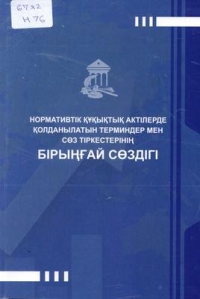| Нормативтік құқықтық актілерде қолданылатын терминдер мен сөз тіркестерінің біріңғай сөздігі 67я2 Н 76 Нормативтік құқықтық актілерде қолданылатын терминдер мен сөз тіркестерінің біріңғай сөздігі [Мәтін] : 1500-ден астам термин мен сөз тіркесі / ҚР Ғылым және жоғары білім м-гі, Тіл саясаты комитеті. – Көкшетау : Старков С. А., 2025. – 319 б.