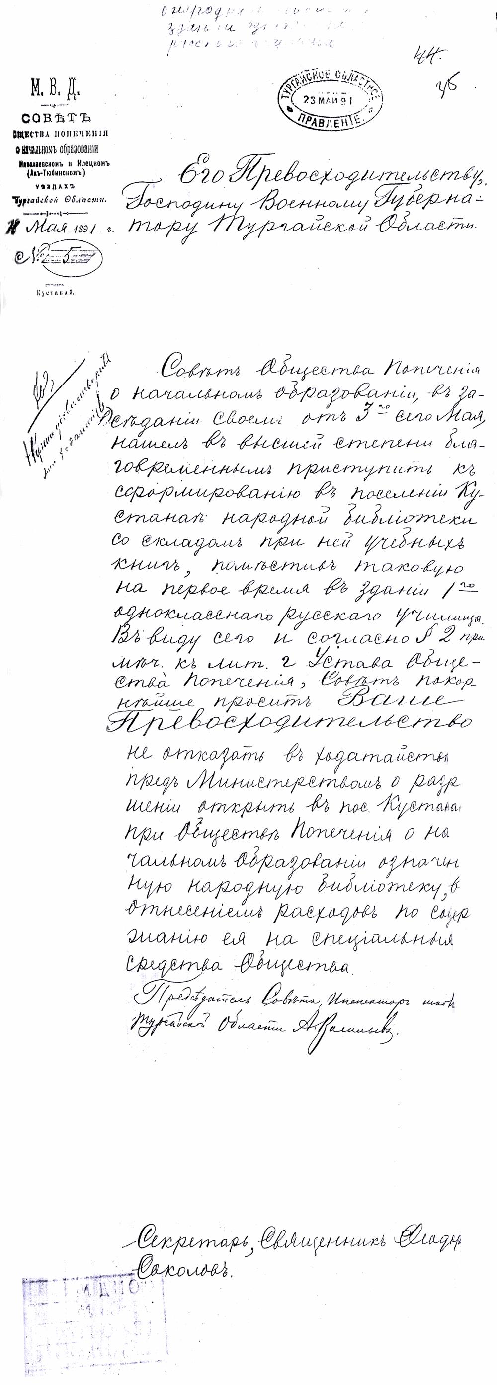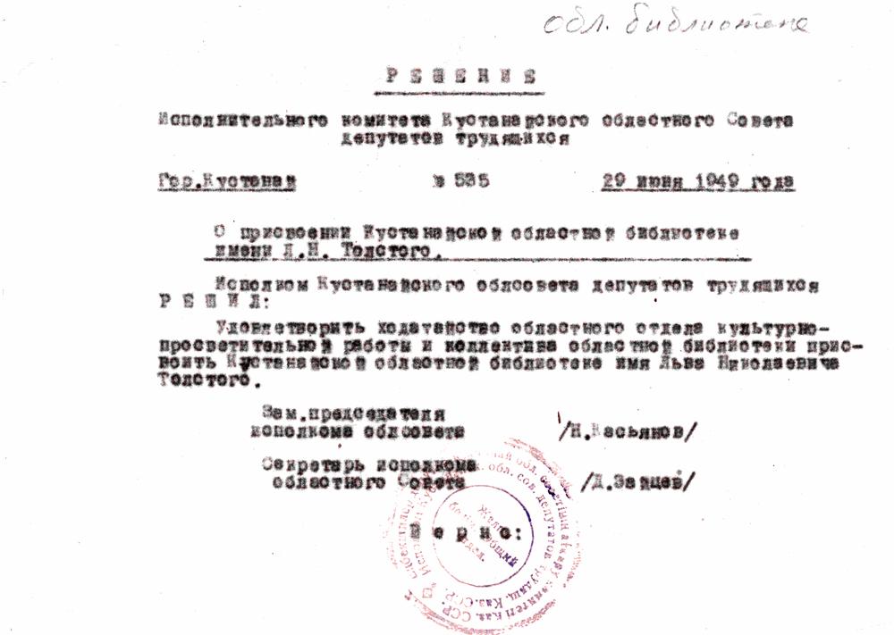 | История В дореволюционном Казахстане библиотеки создавались, главным образом, в губернских и уездных городах, где преобладало русское население. В 1891 Тургайское общество попечения о распространении начального образования среди русских переселенцев Кустанайского уезда обратилось с ходатайством к военному губернатору Тургайской области с просьбой об открытии в Кустанае бесплатной Народной читальни. В 1892 году такая читальня была открыта, в ней имелось 467 названий книг, и работала она на основе Устава. В 1894 году в Народном доме г. Кустаная была открыта первая публичная библиотека. В имеющихся документах библиотеки отмечается следующее: «С января 1937 года, в связи с образованием Кустанайской области, городская библиотека стала именоваться областной библиотекой». В 1949 году, в 120-летний юбилей великого русского писателя Льва Николаевича Толстого библиотеке было присвоено его имя. О том, что это имя присвоено библиотеке не случайно, свидетельствуют архивные документы. Особый интерес в наследии Л.Н.Толстого заслуживает неопубликованная переписка с читателями-крестьянами. В последние годы жизни Л.Н.Толстой получал множество писем из самых отдаленных уголков России, в том числе и из национальных окраин. Ни одна строка не оставалась без внимания адресата, о чем свидетельствуют ответные письма и пометки писателя на полученной корреспонденции. Примечательной в этом отношении представляется переписка с крестьянами Кустанайского уезда Тургайской губернии. В фондах московского музея Л.Н.Толстого имеются «кустанайские следы»: более десяти отлично сохранившихся писем кустанайцев В.И.Касиванова и И.В.Колесникова. На каждом – личные пометки писателя. Немалый интерес в этом плане представляют местные источники, в том числе фонды литературного музея Кустанайского пединститута. Материалы, рассказывающие о переписке Льва Николаевича с кустанайцами, были собраны ныне покойным профессором Кустанайского педагогического института Н.И.Кандалиным, который занимался исследовательской работой по этому вопросу и не раз посещал музей Л.Н.Толстого в Москве. Переписка Л.Н.Толстого с кустанайцем Василием Исаевичем Касивановым относится к 1907-1908 гг. В эту пору Л.Н.Толстой жил в Ясной Поляне. В.Касиванов – выходец из крестьян Самарской губернии, переселившихся в казахское Зауралье. 24 января отсюда и было отправлено письмо Л.Н.Толстому. Автор говорит о своей заинтересованности сочинениями писателя, просит сообщить, как и где можно приобрести его книги. Секретарь Толстого на конверте письма Касиванова пометил: «Касиванов просит книг. Кустанай». Прочитав письмо, писатель не отказал «захолустному уголку» и распорядился: «Послать книги». Второе письмо, посланное 25 мая того же года, свидетельствует о том, что книги пришли по назначению. От своего имени, от имени слушателей книг Толстого (книги читали вслух, т. к. большинство кустанайских крестьян было неграмотно) Касиванов начертал: «Не могу описать, с каким увлечением заслушиваются мужички-землерои, когда читаешь Ваше правдивое учение, ведущее прямым путем от вечного рабства к равенству и свободе». Третье письмо В.Касиванова, написанное 31 марта 1908 года, - пожалуй, наиболее интересное. Кроме благодарности за полученные в подарок книги («пятнадцать брошюрок»), письмо содержит примечательные размыш