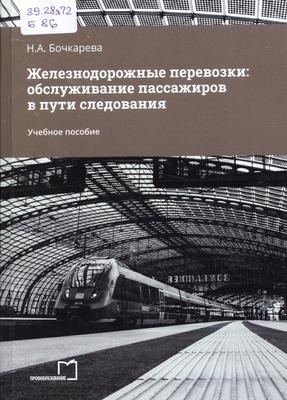 | Бочкарева, Н. А. Железнодорожные перевозки: обслуживание пассажиров в пути следования 39.28я72 Б 86 Бочкарева, Н. А. Железнодорожные перевозки: обслуживание пассажиров в пути следования [Текст] : учеб. пособие для ТиПО / Н. А. Бочкарева. – 2-е изд. – Саратов : Профобразование, 2024. – 194 с. – (Техническое и профессиональное образование).