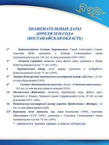 | Календарь знаменательных дат Костанайской области 2020 года.