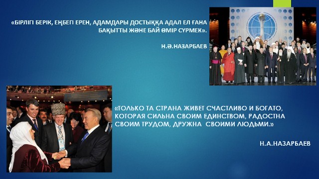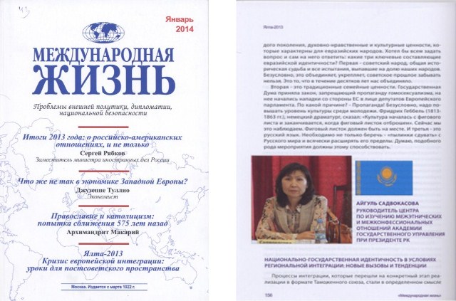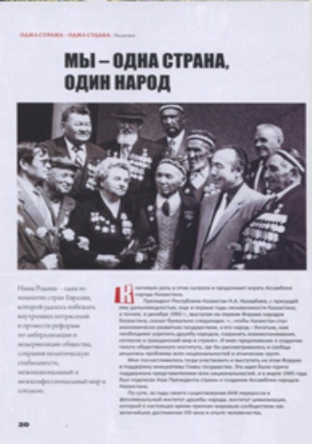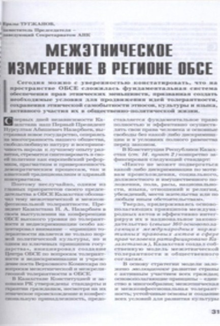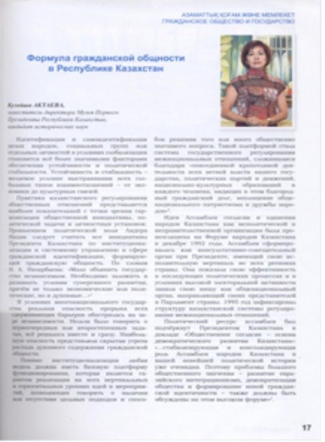 | Единство народов – основа стабильного развития Казахстана ![]() Куттыкадам, С. Основы казахстанской толерантности и межконфессионального согласия [Текст] / С. Куттыкадам // Мысль. - 2010. - № 1. - С. 22-24. Статья подготовлена на основе доклада на международном семинаре «СМИ в укреплении межэтнической толерантности» (ЕНУ им. Гумилева, Астана, ноябрь 2009 года). В статье кратко, но всесторонне рассматривается феномен казахской толерантности, высказывается надежда на то, что у руководства страны, Ассамблеи народа Казахстана хватит мудрости, терпения и настойчивости в искреннем стремлении к созданию процветающего, открытого и духовного общества. Садвокасова, А. Национально-государственная идентичность в условиях региональной интеграции [Текст] : новые вызовы и тенденции / А. Садвокасова // Международная жизнь. - 2014. - № 1. - С. 156-165. Руководитель центра по изучению межэтнических и межконфессиональных отношений академии государственного управления при президенте РК, Айгуль Садвокасова публикует научную статью о национально-государственном развитии Казахстана в настоящее время. Большое внимание в статье уделяется национальному единству Казахстана. Тугжанов, Е. Межэтническое измерение в регионе ОБСЕ [Текст] / Е. Тугжанов // Мысль. - 2010. - № 10. - С. 31-33. В своей статье, Ералы Тугжанов (заместитель Председателя – заведующий Секритариатом АНК) говорит о том, что сегодня можно с уверенностью констатировать, что на пространстве ОБСЕ сложилась фундаментальная система обеспечения прав этнических меньшинств, призванная создать необходимые условия для продвижения идей толерантности, сохранения этнической самобытности этносов, культуры и языка, активного участия их в общественно – политической жизни. Беркешева, Р. Под общим шаныраком [Текст] / Р. Беркешева // Достык-Дружба. - 2012. - № 2. - С. 28-33. Директор Дома дружбы города Актобе, Роза Беркешева, в своей статье с любовью и гордостью рассказывает о своем городе, о работе Дома дружбы города Актобе. Основная мысль статьи о том, что конечно, у каждого этнокультурного объединения есть свои задачи – сберечь для будущих поколений все самое ценное, что веками хранилось в памяти народной, чтобы не канули в Лету звучные напевы наших бабушек, не забылся язык, обряды и традиции, присущие только определенному этносу. Но общим для всех нас остается любовь к родной земле, олицетворением которогоявляется»шанырак» общего дома – Дома дружбы. Доверие, вселяющее надежду [Текст] : [с гражданского форума по вопросам толерантности стран СВМДА] // Достык-Дружба. - 2013. - № 3. - С. 7-9.Доверие, вселяющее надежду // Достык-Дружба.-2013.-№3.-С.7-9 Ассамблея народа Казахстана совместно с Министерством культуры и информации РК провела международный Форум национально-культурных центров народов стран СВМДА: «Гражданский Форум по вопросам толерантности стран СВМДА». Участники Форума констатируют, что общественное согласие в этнополитическом и этносоциальном контексте обретает широкое международное значение как важный фактор внутренней стабильности государств, их успешного развития и безопастности. Актаева, К. Формула гражданской общности в Республике Казахстан [Текст] / К. Актаева // Мирас. - 2012. - № 3. - С. 17-19. По словам Н.А.Назарбаева: «Мало объявить государство независимым. Необходимо заложить и развивать условия суверенного развития, причем не толь